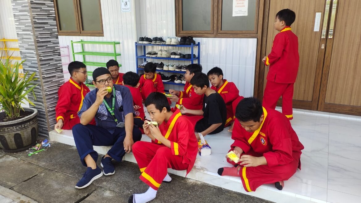 *Selesai senam, dilanjutkan kegiatan menebar keberkahan lewat pembagian kue jajan maupun sarapan pagi untuk warga sekitar sekolah. Siswa kelas I di TK Aisyiyah 34 Kedanyang hingga siswa Kelas VI di Perumahan Green Prambangan Residence (GPR) yang tepat berada di sebelah barat SD Alam ini.
