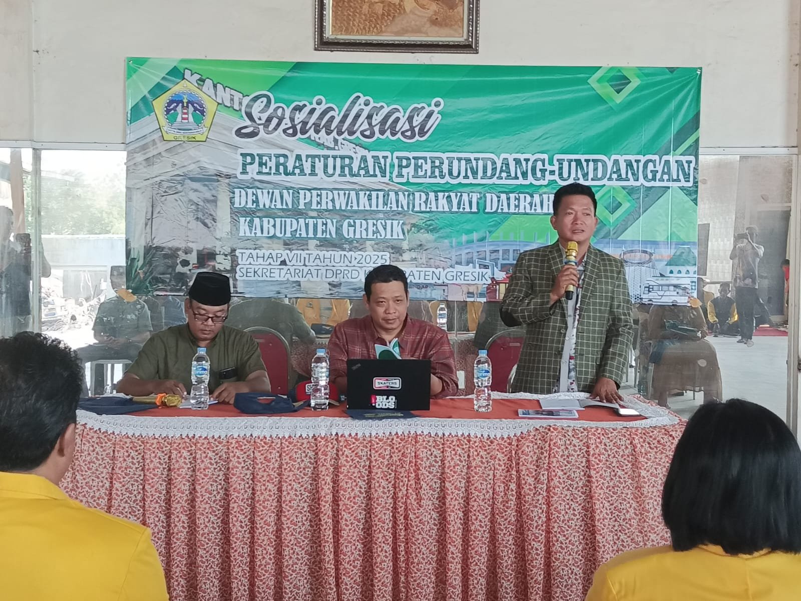 GRESIK, SabdaNews.com- Ketua Komisi II Dewan Perwakilan Rakyat Daerah (DPRD) Kabupaten Gresik Wongso Negoro, SE, SH, MSi menggelar sosialisasi peraturan daerah (sosper) tahap VII Sabtu (23/8) di Desa Pengalangan Kecamatan Menganti Kabupaten Gresik. Dalam pemaparannya, Pria yang akrab disapa Pak Wong itu menyampaikan dua Peraturan Daerah (Perda) yaitu Perda Kab. Gresik No. 2 tahun 2023 tentang Pengelolaan Zakat, Infak dan Sedekah dan Perda Kab. Gresik No. 7 tahun 2023 tentang Penyelenggaraan Smart City.