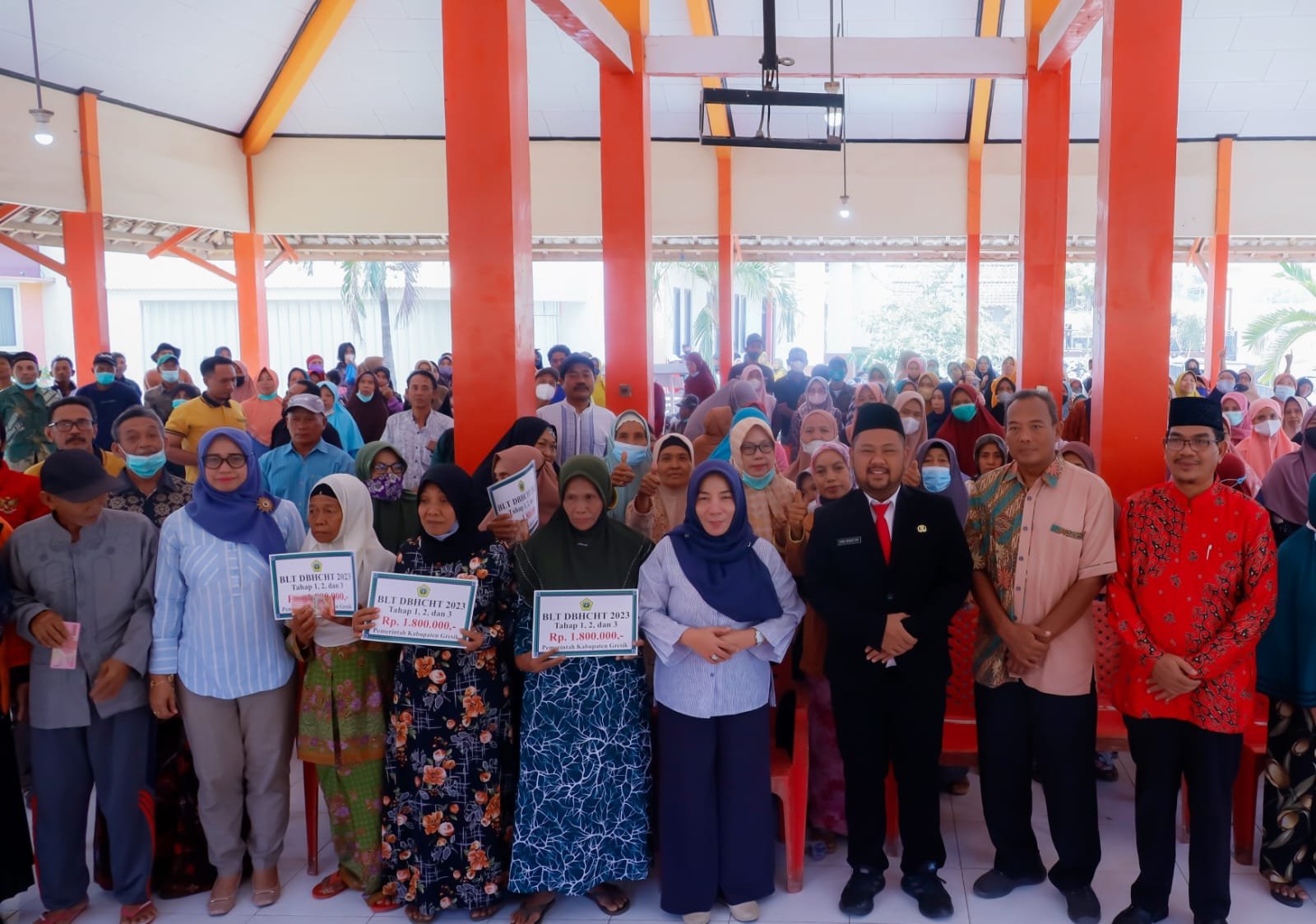 Sejak Rabu, 13 September hingga hari ini, Minggu, 17 September, diketahui Pemkab Gresik telah menyalurkan DBHCHT kepada ratusan warga dari 4 kecamatan di wilayah Gresik Utara (Dukun 172 orang, Ujungpangkah 92 orang, Bungah 166 orang, dan Panceng 182 orang). “Jadi bantuan ini kita berikan sekaligus sebanyak 3 tahap. Sehingga masing-masing orang akan menerima Rp. 600.000 x 3 yaitu Rp. 1.800.000. Sebetulnya dalam satu tahun ini ada 4 tahap penyaluran, dan tahap terakhir insyaallah akan diberikan akhir tahun 2023 ini.” ungkap Kadinsos Ummi saat memberikan laporan.