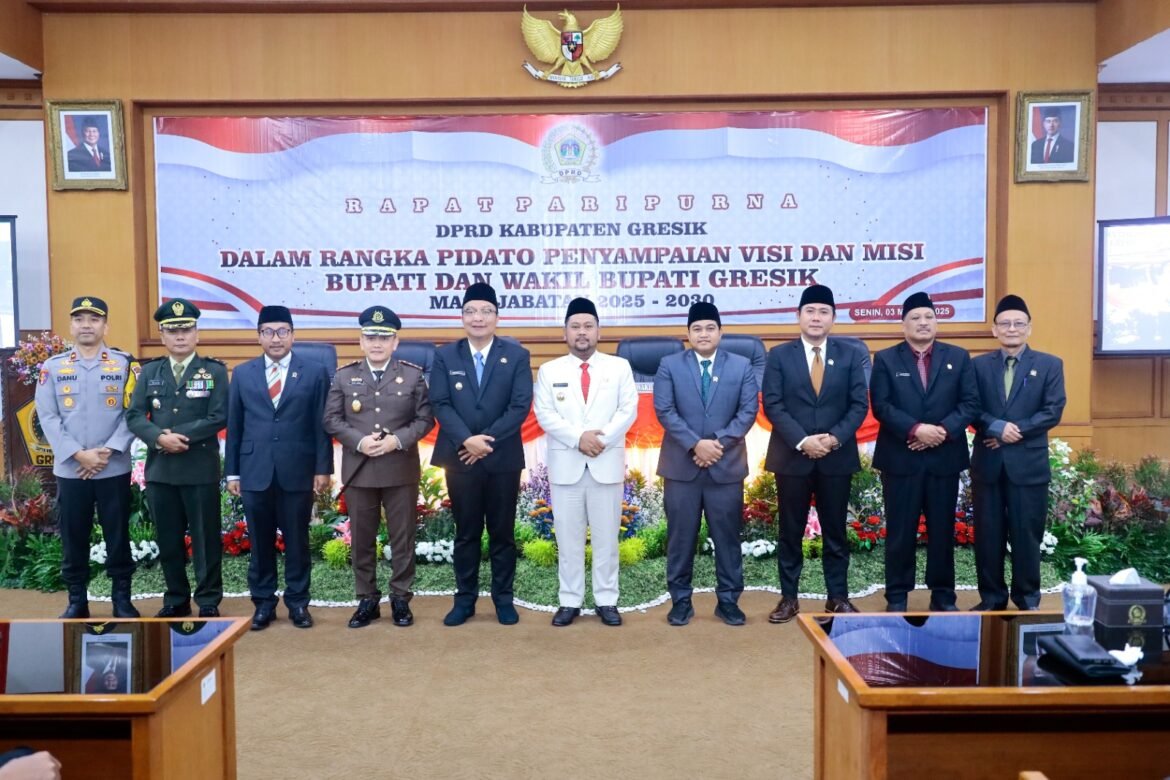 GRESIK, SabdaNews.com — Bupati Gresik, Fandi Akhmad Yani, dan Wakil Bupati Gresik, Asluchul Alif, memaparkan visi dan misi masa jabatan 2025-2030 dalam Rapat Paripurna yang digelar di Ruang Paripurna Gedung DPRD Gresik pada Senin, 3 Maret 2025.