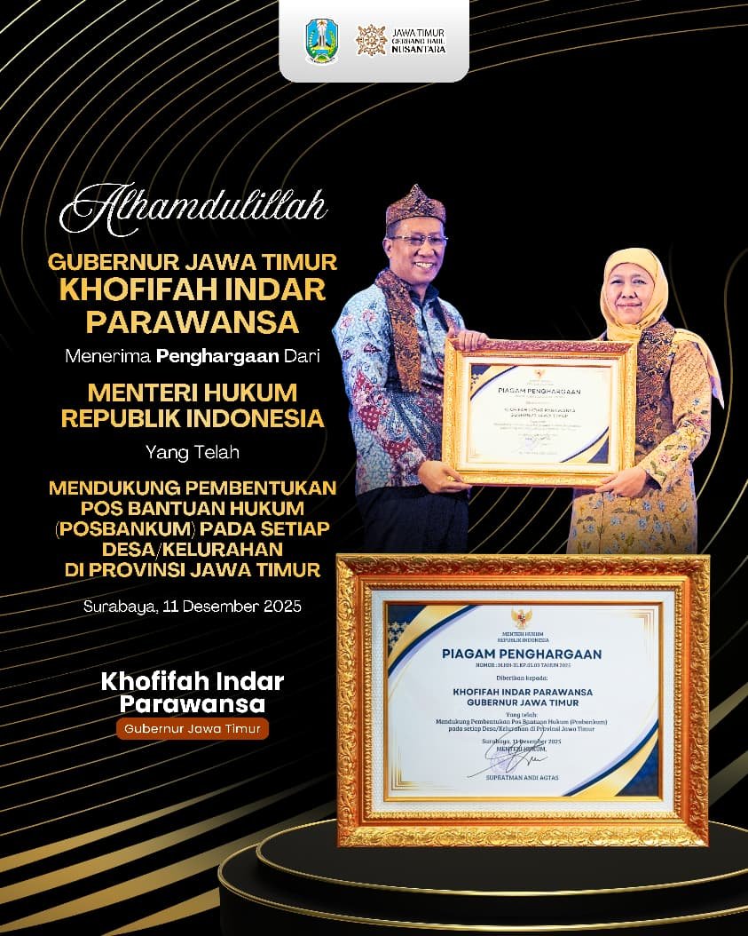 SabdaNews.com – Gubernur Jawa Timur Khofifah Indar Parawansa menerima penghargaan dari Kementerian Hukum RI atas keberhasilan terbentuknya 8.494 Pos Bantuan Hukum (Posbankum) Desa/Kelurahan di seluruh Jawa Timur.