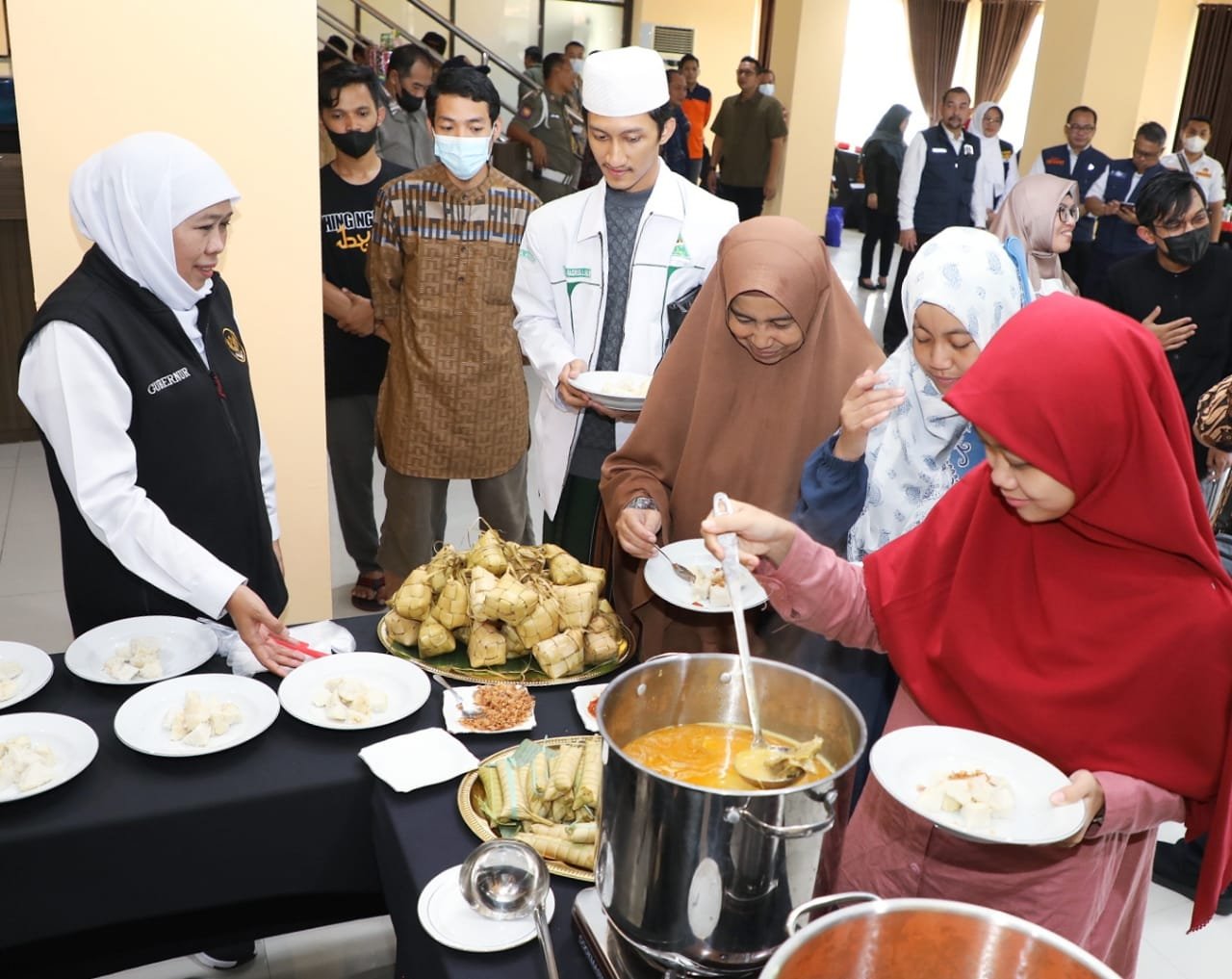 Dengan telaten dan sabar, Gubernur Khofifah menjamu dan melayani para warga Jatim yang memang lama tidak merasakan ketupat dan lepet lebaran selama berada di Sudan.