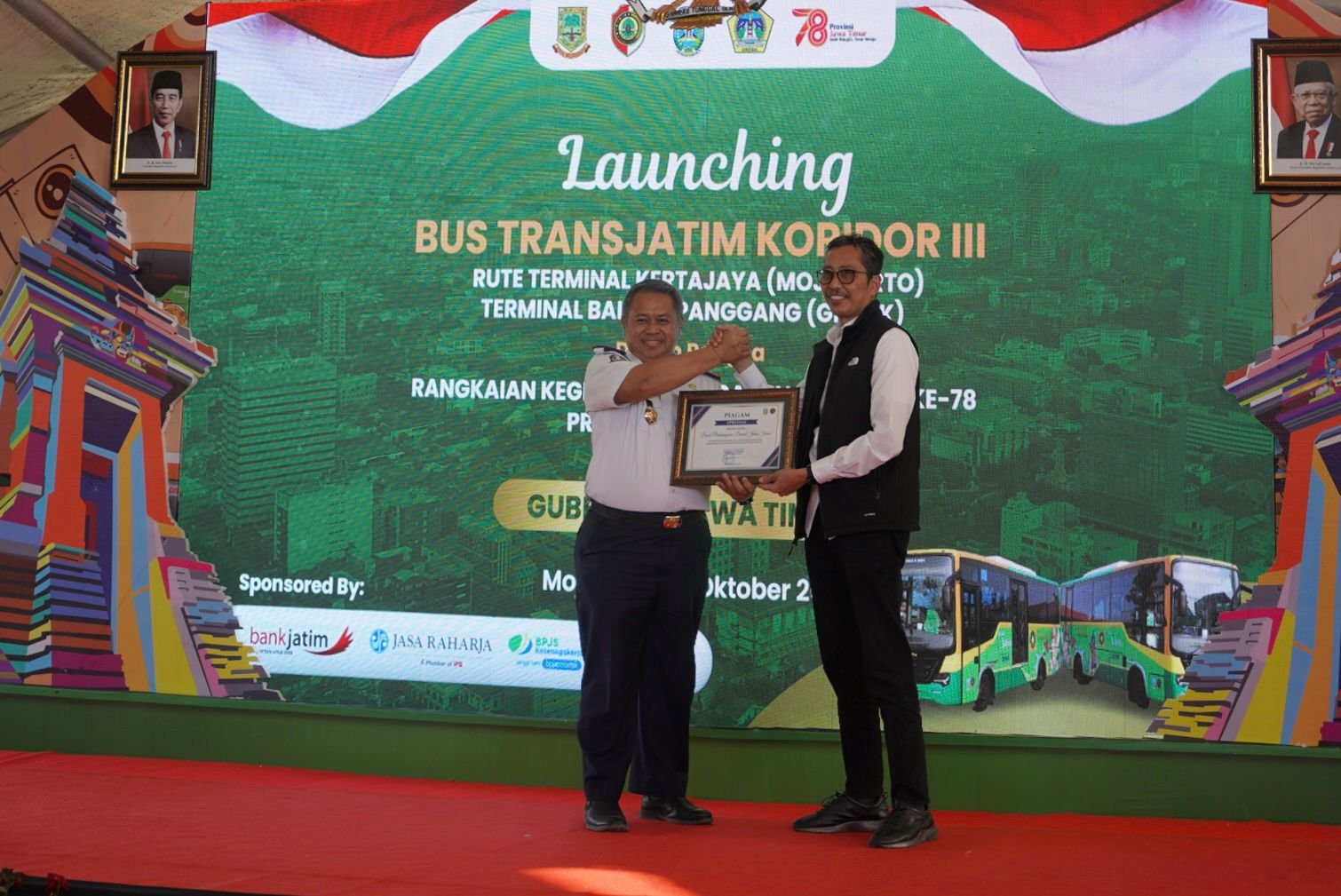 Dalam kesempatan tersebut, PT Bank Pembangunan Daerah Jawa Timur Tbk (bankjatim) memperoleh piagam apresiasi atas terlaksananya kerja sama penyediaan fasilitas dan media promosi pada tenant UMKM di Terminal Type-B Kertajaya Mojokerto. Penghargaan diserahkan oleh Kepala Dinas Perhubungan (Kadishub) Jawa Timur Nyono dan diterima oleh Busrul Iman.