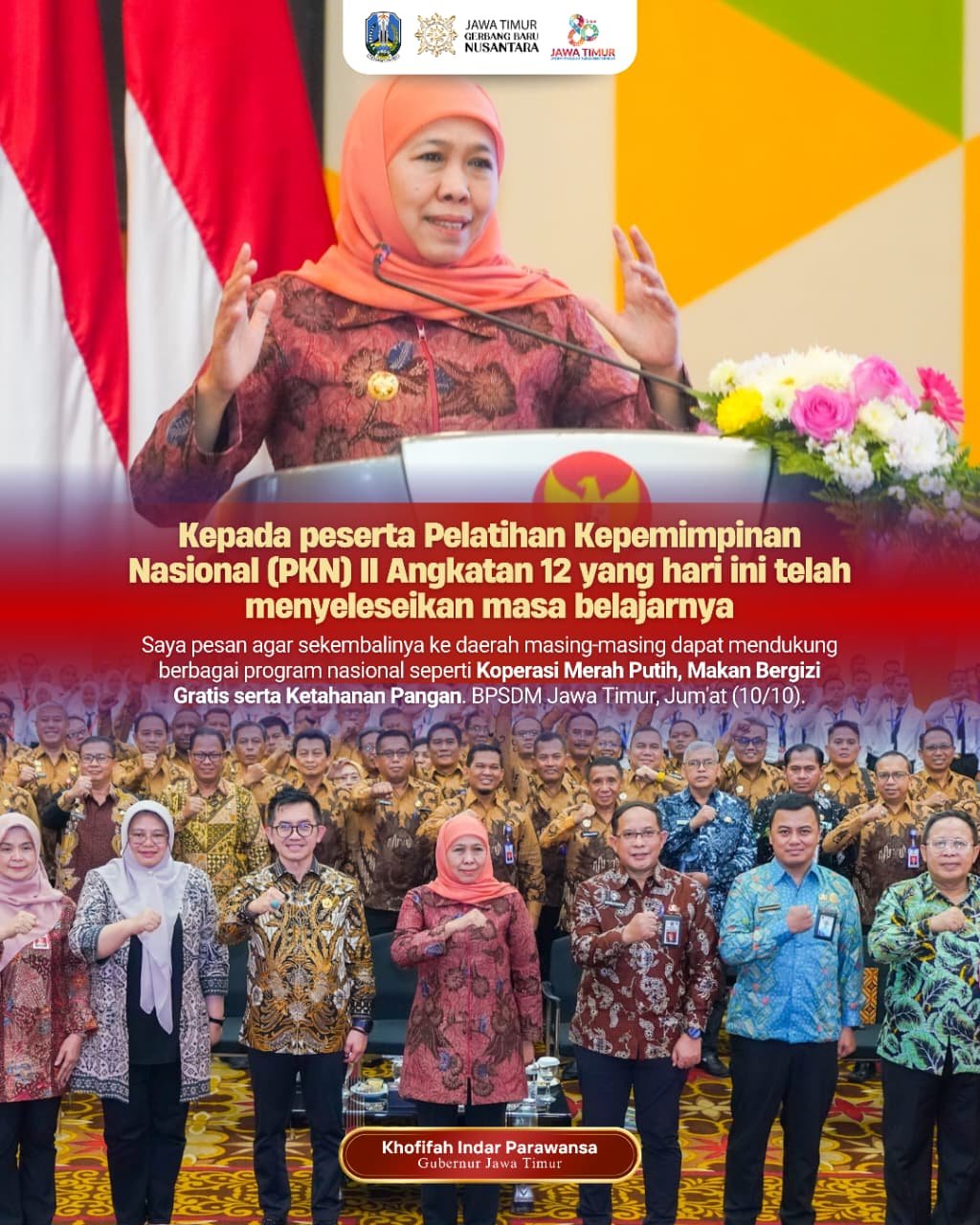 SabdaNews.com – Gubernur Jawa Timur Khofifah Indar Parawansa menutup kegiatan Pelatihan Kepemimpinan Nasional (PKN) Tingkat II Angkatan XII Tahun 2025 di Badan Pengembangan Sumber Daya Manusia (BPSDM) Provinsi Jawa Timur, Jumat (10/10/2025).