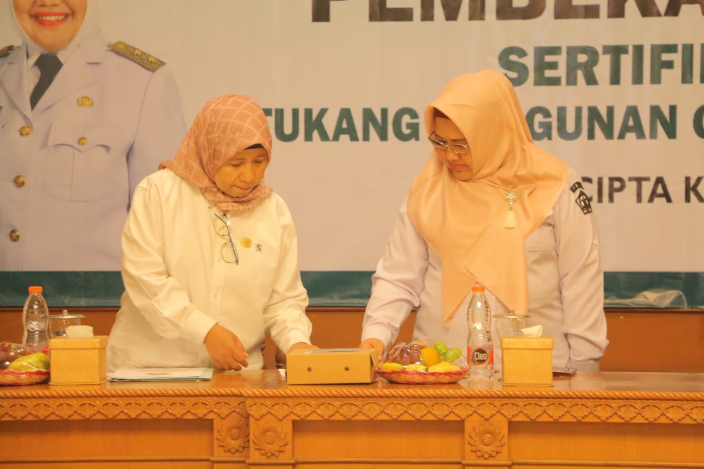 Ia melanjutkan, Undang-undang ini bertujuan untuk menjamin ketertiban dan kepastian hukum dalam penyelenggaraan jasa konstruksi. “Pengaturan jasa konstruksi berlandaskan pada asas kejujuran dan keadilan, manfaat, keserasian, keseimbangan, kemandirian, keterbukaan, kemitraan, dan keselamatan demi kepentingan masyarakat, bangsa, dan negara,” singkatnya. Selanjutnya, penyematan tanda peserta secara simbolis oleh Wakil Bupati Gresik Aminatun Habibah didampingi Kepala Dinas CKPKP Ida Lailatussa’diyah kepada peserta. (Rls/gus/Red)
