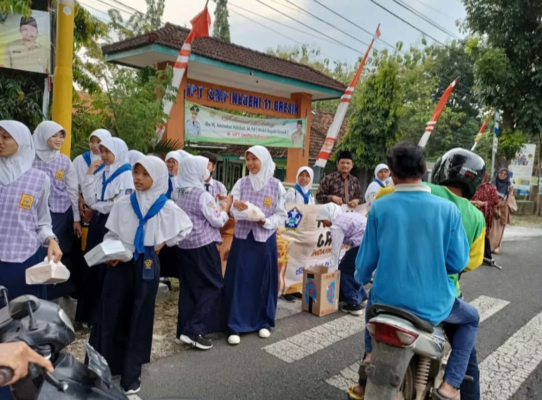 GRESIK,SabdaNews.com- Jargon sebagai sekolah “Religious School” benar-benar diterapkan secara nyata oleh UPT SMP Negeri 11 Gresik (Sebelumya bernama SMPN 1 Dukun, Red). Betapa tidak, di momen Bulan Suci Ramadan ini, sekolah yang dipimpin Sunikan, S.Kom, M.Pd ini gencar berbagi takjil gratis kepada para pengguna jalan serta masyarakat yang ada di sekitar sekolah.