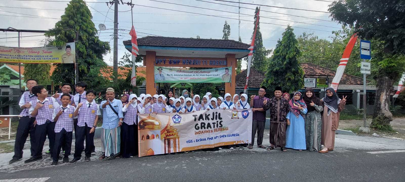 “Untuk hari ini, OSIS dan PMR didampingi para guru dengan penuh semangat disertai rasa syukur membagikan ratusan takjil gratis kepada masyarakat yang melintas di depan UPT SMP Negeri 11 Gresik,” terang Kepala Sekolah muda yang saat ini tengah menempuh Pendidikan S3 di Universitas Negeri Surabaya ini, Sabtu (8/4/2023).