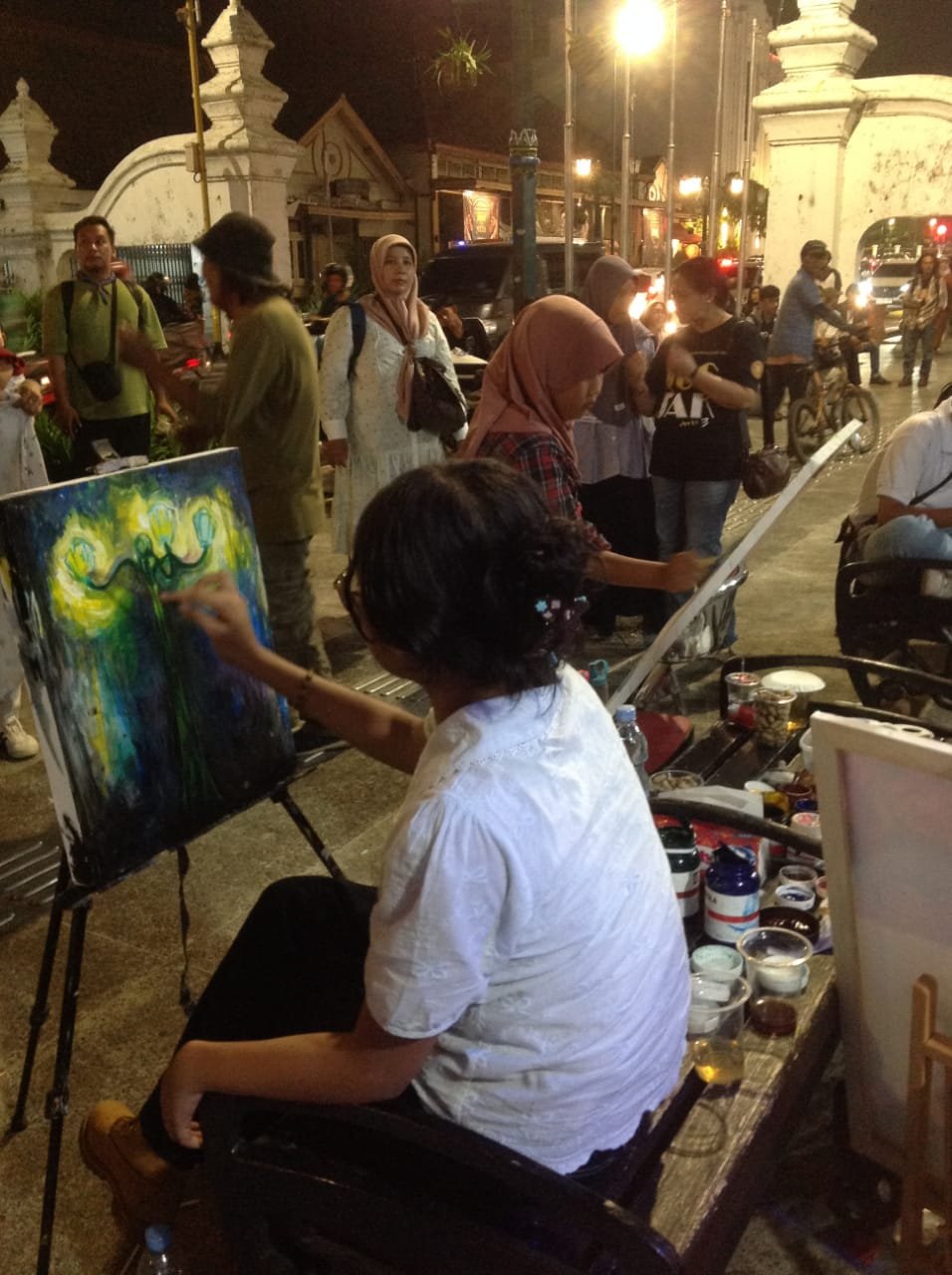 Sedangkan Aliya Murdoko (usia 14 tahun) dari Kota Malang, Annisa Nismara (usia 9 tahun) dari Gresik dan Fatimah (usia 9 tahun) dari Surabaya, melukis dengan media cat akrilik pada kanvas. Fatimah yang merupakan pelukis cilik disabilitas, melukis dengan penuh percaya diri menggunakan tangan sekaligus kakinya, dengan duduk di atas kursi roda didampingi Arik S. Wartono selaku pembina Sanggar DAUN dan orang tuanya.